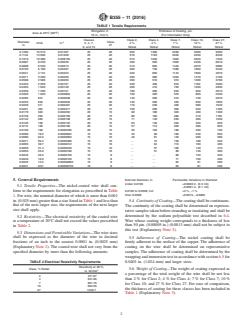 ABSTRACT This specification covers nickel-coated, soft or annealed, round copper wire for use in electrical equipment. Five classes of wire are covered as follows: Class 2, Class 4, Class 7, Class 10, and Class 27. Properties like elongation, resistivity and dimensions of the wire shall be determined. The continuity of the coating shall be determined by the sodium polysulfide test. Adherence of the coating shall be determined by wrapping and immersion tests. SCOPE 1.1 This specification covers nickel-coated, soft or annealed, round copper wire for use in electrical equipment. 1.2 Five classes of wire are covered as follows: 1.2.1 Class 2—Wire whose nickel coating is at least 2 % of the total weight of the coated wire. 1.2.2 Class 4—Wire whose nickel coating is at least 4 % of the total weight of the coated wire. 1.2.3 Class 7—Wire whose nickel coating is at least 7 % of the total weight of the coated wire. 1.2.4 Class 10—Wire whose nickel coating is at least 10 % of the total weight of the coated wire. 1.2.5 Class 27—Wire whose nickel coating is at least 27 % of the total weight of the coated wire. Note 1: For information purposes, the thickness of coating in microinches provided by the percentages listed in 1.2 is shown in Table 2. 1.3 The values stated in inch-pound units are to be regarded as standard. The values given in parenthesis are mathematical conversions to SI units that are provided for information only and are not considered standard. 1.3.1 Exceptions—The SI values for density, resistivity, and volume are to be regarded as standard. 1.4 This hazard statement applies only to Section 7, Test Methods, and to the Appendix of this specification. This standard does not purport to address all of the safety concerns, if any, associated with its use. It is the responsibility of the user of this standard to establish appropriate safety and health practices and determine the applicability of regulatory limitations prior to use.