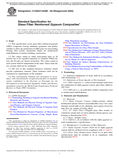 ASTM C1355/C1355M-96(2020) is a technical specification published by ASTM International. Its full title is "Standard Specification for Glass Fiber Reinforced Gypsum Composites". This standard covers: ABSTRACT This specification covers glass fiber reinforced gypsum (GRG) composites suitable for producing GRG parts for non-loading bearings, thin sections, and ornamental shapes for architectural embellishment of interior building construction. Both the neat alpha gypsum cement and the resulting composite materials should conform to the specified physical and mechanical properties such as hardness, flexural strength, impact resistance, coefficient of linear thermal expansion, humidified deflection, surface burning characteristics, and nail pull resistance. SCOPE 1.1 This specification covers glass fiber reinforced gypsum (GRG) composites having minimum properties and quality suitable to allow the production of GRG parts for non-loading bearing, thin section, ornamental shapes for architectural embellishment of interior building construction. 1.2 The values stated in either inch-pound units or SI [metric] are to be regarded separately as standard. Within the text, the SI units are shown in brackets. The values stated in each system shall be independent of the other. Values from the two systems shall not be combined. 1.3 The text of this standard references footnotes which provide explanatory material. These footnotes shall not be considered as requirements of the standard. 1.4 This international standard was developed in accordance with internationally recognized principles on standardization established in the Decision on Principles for the Development of International Standards, Guides and Recommendations issued by the World Trade Organization Technical Barriers to Trade (TBT) Committee.