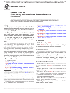 ASTM F3450-20: Standard Guide for Flight Hazard and Surveillance Systems Personnel Certification outlines the essential knowledge areas and competencies required for avionics technicians seeking certification to work with Flight Hazard and Surveillance Systems (FHSS). Developed by ASTM International, this guide is primarily intended to assess and verify the capabilities of qualified individuals aspiring to become certified FHSS technicians through a recognized certification program. Importantly, this standard serves as an endorsement for the Aircraft Electronics Technician (AET) certification, and only certified AETs are eligible to pursue the FHSS endorsement. The guide is used in tandem with the certification provider’s materials for exam preparation, management, and administration.