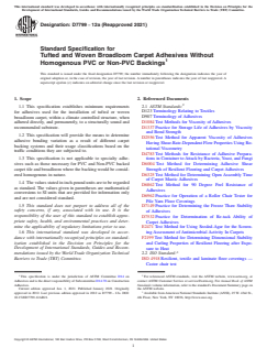ASTM D7799-12a(2021) is a technical specification published by ASTM International. Its full title is "Standard Specification for Tufted and Woven Broadloom Carpet Adhesives Without Homogenous PVC or Non-PVC Backings". This standard covers: ABSTRACT This specification establishes minimum requirements for adhesives used for the installation of tufted or woven broadloom carpet, within a climate controlled structure, when adhered directly, and permanently, to a structurally sound and recommended substrate. It provides the means to determine adhesive bonding variation as a result of different carpet backing systems and their usage classifications based on the traffic conditions they are subjected to. This specification also describes classification, standard conditioning, chemical composition, physical properties, performance requirements, sampling, certification, and packaging and package marking. SCOPE 1.1 This specification establishes minimum requirements for adhesives used for the installation of tufted or woven broadloom carpet, within a climate controlled structure, when adhered directly, and permanently, to a structurally sound and recommended substrate. 1.2 This specification will provide the means to determine adhesive bonding variation as a result of different carpet backing systems and their usage classifications based on the traffic conditions they are subjected to. 1.3 This specification is not applicable to specialty adhesives such as those necessary for PVC and Non-PVC backed carpet tile and broadloom where the backing would be considered homogenous in nature. 1.4 The values stated in inch-pound units are to be regarded as standard. The values given in parentheses are mathematical conversions to SI units that are provided for information only and are not considered standard. 1.5 This standard does not purport to address all of the safety concerns, if any, associated with its use. It is the responsibility of the user of this standard to establish appropriate safety, health, and environmental practices and determine the applicability of regulatory limitations prior to use. 1.6 This international standard was developed in accordance with internationally recognized principles on standardization established in the Decision on Principles for the Development of International Standards, Guides and Recommendations issued by the World Trade Organization Technical Barriers to Trade (TBT) Committee.