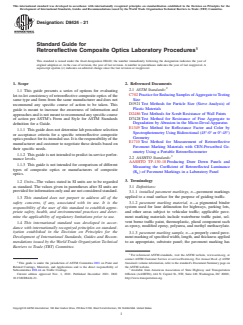 SIGNIFICANCE AND USE 5.1 The nighttime retroreflective properties of pavement markings are known to improve driving safety. Retroreflective composite optics have been developed to improve retroreflectivity in dry and rainy wet conditions. For customers purchasing these materials it’s important to verify the consistency and performance. This guide provides a set of laboratory procedures which can be selected individually or together to evaluate lot-to-lot consistency of composite optics of the same type and manufacturer. These are not in-service performance procedures and don’t necessarily predict in-service performance. SCOPE 1.1 This guide presents a series of options for evaluating lot-to-lot consistency of retroreflective composite optics of the same type and form from the same manufacturer and does not recommend any specific course of action to be taken. This guide is meant to increase the awareness of information and approaches and is not meant to recommend any specific course of action per ASTM’s Form and Style for ASTM Standards definition for a Guide. 1.1.1 This guide does not determine lab procedure selection or acceptance criteria for a specific retroreflective composite optics product for its intended use. It is the responsibility of the manufacturer and customer to negotiate these details based on their specific needs. 1.1.2 This guide is not intended to predict in-service performance levels. 1.1.3 This guide is not intended for comparison of different types of composite optics or manufacturers of composite optics. 1.2 Units—The values stated in SI units are to be regarded as standard. The values given in parentheses after SI units are provided for information only and are not considered standard. 1.3 This standard does not purport to address all of the safety concerns, if any, associated with its use. It is the responsibility of the user of this standard to establish appropriate safety, health, and environmental practices and determine the applicability of regulatory limitations prior to use. 1.4 This international standard was developed in accordance with internationally recognized principles on standardization established in the Decision on Principles for the Development of International Standards, Guides and Recommendations issued by the World Trade Organization Technical Barriers to Trade (TBT) Committee.