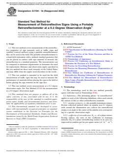 ASTM E1709-16(2022), Standard Test Method for Measurement of Retroreflective Signs Using a Portable Retroreflectometer at a 0.2 Degree Observation Angle, is a key international standard developed by ASTM International. This method outlines procedures for field and laboratory measurement of the retroreflective performance of vertical sign materials such as traffic signs and symbols. The standard is especially significant in ensuring the night-time visibility and safety effectiveness of traffic signage by establishing a systematic approach for measuring the brightness of retroreflective materials using a handheld, portable retroreflectometer.