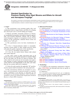 ASTM A646/A646M-17(2022) is a technical specification published by ASTM International. Its full title is "Standard Specification for Premium Quality Alloy Steel Blooms and Billets for Aircraft and Aerospace Forgings". This standard covers: ABSTRACT This specification deals with the standard requirements for premium quality alloy steel semifinished rolled or forged blooms and billets for reforging into aircraft and aerospace critical parts such as landing-gear forgings. Covered here are three basic classifications of steel, namely: Class I, steel manufactured by vacuum-induction melting or consumable-electrode vacuum melting process; Class II, air-melted steel manufactured by electric-furnace vacuum degassing process; Class III, air-melted steel manufactured by electric-furnace ladle refining and vacuum degassing processes. Steel materials shall be heat-treated and hot-worked by either hot rolling or forging. Alloy steels shall be examined by heat and product analyses and hardenability tests, and shall conform to chemical composition and maximum annealed Brinell hardness requirements. Quality evaluation tests, such as macrotech, microcleanliness, and nondestructive ultrasonic (both immersion and contact examination) inspection, shall be performed as well. SCOPE 1.1 This specification covers premium quality alloy steel semifinished rolled or forged blooms and billets for reforging into critical parts such as aircraft landing-gear forgings. 1.2 Blooms and billets, hereinafter referred to as blooms, are semifinished steel products, hot rolled or forged to approximate cross-sectional dimensions. Blooms may be square, round, hexagonal, octagonal, or rectangular in section. For the purposes of this specification, minimum bloom section size will be 16 in.2 [103 cm2]. 1.3 This specification covers two basic classifications of steel: 1.3.1 Class I—Vacuum-induction melted or consumable-electrode vacuum melted, or other suitable processes which will satisfy the quality requirements of this specification. 1.3.2 Class II—Air-melted vacuum degassed. 1.3.3 Class III—Air melted electric furnace ladle refined and vacuum degassed. 1.4 The values stated in either inch-pound units or SI (metric) units are to be regarded separately as standard. Within the text and tables, the SI units are shown in brackets. The values stated in each system are not necessarily exact equivalents; therefore, to ensure conformance with the standard, each system shall be used independently of the other, and values from the two systems shall not be combined. 1.5 Unless the order specifies the applicable “M” specification the material shall be furnished to the inch-pound units. 1.6 This international standard was developed in accordance with internationally recognized principles on standardization established in the Decision on Principles for the Development of International Standards, Guides and Recommendations issued by the World Trade Organization Technical Barriers to Trade (TBT) Committee.
