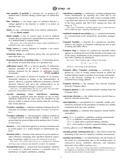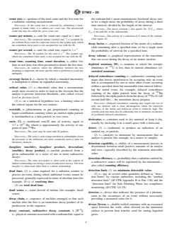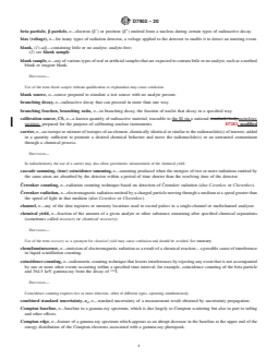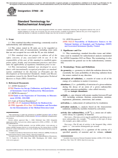 SIGNIFICANCE AND USE 3.1 This terminology standard describes terms and definitions used in standards for radiochemical analysis maintained by ASTM Committee D19 on Water. The terminology is also recommended for general use in the radiochemistry community. SCOPE 1.1 This standard describes terminology commonly used in radiochemistry and radioanalysis. 1.2 The values stated in SI units are to be regarded as standard. Other units of measurement, including some units that are not accepted for use with the SI, are also defined. 1.3 This standard does not purport to address all of the safety concerns, if any, associated with its use. It is the responsibility of the user of this standard to establish appropriate safety, health, and environmental practices and determine the applicability of regulatory limitations prior to use. 1.4 This international standard was developed in accordance with internationally recognized principles on standardization established in the Decision on Principles for the Development of International Standards, Guides and Recommendations issued by the World Trade Organization Technical Barriers to Trade (TBT) Committee.