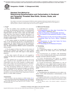 ASTM F2328M-17(2022) is a standard published by ASTM International. Its full title is "Standard Test Method for Determining Decarburization and Carburization in Hardened and Tempered Threaded Steel Bolts, Screws, Studs, and Nuts (Metric)". This standard covers: SIGNIFICANCE AND USE 4.1 Decarburization and carburization are two surface conditions created, either intentionally or unintentionally, as with a pre-existing condition created during the rod rolling process, the rod/wire annealing process, or while heat treating threaded steel products. Too much of either will adversely affect the safety and performance of the threaded product. Therefore, limits have been established for four different product groups: the harder and greater the tensile strength of the product, the more susceptible to failure the product becomes if these limits are exceeded. 4.2 When testing to a particular product specification that lists the dimensions and microindentation data to be used, that data shall take precedence over the tables in this test method. 4.3 There are only two viable methods available to detect these deficiencies: either by the visual method or the microindentation method. Both methods are used for routine inspections when evaluations are conducted at a single location on the product sample. Because an evaluation at a specific location may not be representative of the whole part, the referee method employs the microindentation method taken as an average of evaluations conducted on four adjacent threads. This procedure significantly reduces random test variables when compared to testing on a single thread.˙ 4.4 Specifying this test method does not specify or imply that testing shall be for either decarburization or carburization alone or for both conditions. When either test method is performed, both conditions will be apparent and shall be reported. For example, if an order is placed to test for decarburization and none is found but the presence of decarburization is detected, it shall be reported on the test report that carburization was found. SCOPE 1.1 This test method covers procedures for measuring, classifying, and determining the presence of decarburization and carburization in the threaded section of hardened and tempered metric steel bolts, screws, studs, nuts and similar parts which have been heated to facilitate fabrication or to modify their mechanical properties. This test method is not intended to address products which are intentionally carburized to achieve specific results. 1.2 Two routine methods are described for measuring the limits of and determining the presence of decarburization or carburization; the Optical Method and the Microindentation Method 1. Either method is appropriate for routine examinations. The Microindentation Method 2 shall be considered the referee method. 1.3 For the purpose of these tests, there are five classes of hardened and tempered steel products for which specific measurements must be made with respect to their physical properties. 1.4 The values stated in SI units are to be regarded as standard. No other units of measurement are included in this standard. 1.5 This standard does not purport to address all of the safety concerns, if any, associated with its use. It is the responsibility of the user of this standard to establish appropriate safety, health, and environmental practices and determine the applicability of regulatory limitations prior to use. 1.6 This international standard was developed in accordance with internationally recognized principles on standardization established in the Decision on Principles for the Development of International Standards, Guides and Recommendations issued by the World Trade Organization Technical Barriers to Trade (TBT) Committee.