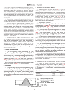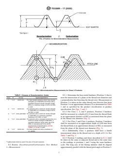SIGNIFICANCE AND USE 4.1 Decarburization and carburization are two surface conditions created, either intentionally or unintentionally, as with a pre-existing condition created during the rod rolling process, the rod/wire annealing process, or while heat treating threaded steel products. Too much of either will adversely affect the safety and performance of the threaded product. Therefore, limits have been established for four different product groups: the harder and greater the tensile strength of the product, the more susceptible to failure the product becomes if these limits are exceeded. 4.2 When testing to a particular product specification that lists the dimensions and microindentation data to be used, that data shall take precedence over the tables in this test method. 4.3 There are only two viable methods available to detect these deficiencies: either by the visual method or the microindentation method. Both methods are used for routine inspections when evaluations are conducted at a single location on the product sample. Because an evaluation at a specific location may not be representative of the whole part, the referee method employs the microindentation method taken as an average of evaluations conducted on four adjacent threads. This procedure significantly reduces random test variables when compared to testing on a single thread.˙ 4.4 Specifying this test method does not specify or imply that testing shall be for either decarburization or carburization alone or for both conditions. When either test method is performed, both conditions will be apparent and shall be reported. For example, if an order is placed to test for decarburization and none is found but the presence of decarburization is detected, it shall be reported on the test report that carburization was found. SCOPE 1.1 This test method covers procedures for measuring, classifying, and determining the presence of decarburization and carburization in the threaded section of hardened and tempered metric steel bolts, screws, studs, nuts and similar parts which have been heated to facilitate fabrication or to modify their mechanical properties. This test method is not intended to address products which are intentionally carburized to achieve specific results. 1.2 Two routine methods are described for measuring the limits of and determining the presence of decarburization or carburization; the Optical Method and the Microindentation Method 1. Either method is appropriate for routine examinations. The Microindentation Method 2 shall be considered the referee method. 1.3 For the purpose of these tests, there are five classes of hardened and tempered steel products for which specific measurements must be made with respect to their physical properties. 1.4 The values stated in SI units are to be regarded as standard. No other units of measurement are included in this standard. 1.5 This standard does not purport to address all of the safety concerns, if any, associated with its use. It is the responsibility of the user of this standard to establish appropriate safety, health, and environmental practices and determine the applicability of regulatory limitations prior to use. 1.6 This international standard was developed in accordance with internationally recognized principles on standardization established in the Decision on Principles for the Development of International Standards, Guides and Recommendations issued by the World Trade Organization Technical Barriers to Trade (TBT) Committee.