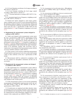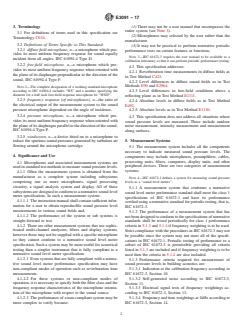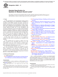 ABSTRACT This specification covers measurement systems used in making sound pressure level measurements in buildings in accordance with ASTM standards and guides. The measurement system includes all the components necessary to indicate measured sound pressure levels, such as microphones, preamplifiers, cables, processing units, filters, computers, display units, and other peripheral devices. Where the system is composed of components, specifications are given for microphone type and orientation, filters and windscreens. This specification does not cover systems for making sound pressure level measurements in other environments, but may include these environments in the future. Performance criteria required for measurement of sound pressure levels in building acoustics are addressed in this specification, along with the requirements for measurements systems which are not designed to conform to a normative sound level meter performance standard. SCOPE 1.1 This specification is for measurement systems used in making sound pressure level measurements in buildings in accordance with ASTM standards and guides. Systems for making sound pressure level measurements in other environments are not addressed in this specification. A future expansion of this specification may include these environments. The systems addressed include one or more microphones and associated components to process the output of the microphone measurement system conforms to a sound level meter specification it is sufficient to specify the category of precision and accuracy required by the measurement system and that direction is given in the user manual for proper use. Where the system is composed of components, specifications are given for microphone type and orientation, filters and windscreens. 1.2 The values stated in SI units are to be regarded as standard. No other units of measurement are included in this standard. 1.3 This standard does not purport to address all of the safety concerns, if any, associated with its use. It is the responsibility of the user of this standard to establish appropriate safety and health practices and determine the applicability of regulatory limitations prior to use. 1.4 This international standard was developed in accordance with internationally recognized principles on standardization established in the Decision on Principles for the Development of International Standards, Guides and Recommendations issued by the World Trade Organization Technical Barriers to Trade (TBT) Committee.