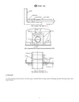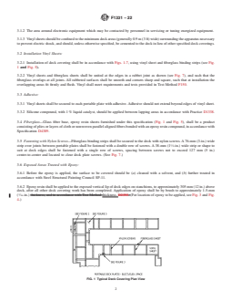 ABSTRACT This practice covers the acceptable installation procedures of insulated vinyl deck covering on portable deck plates. This deck covering shall be installed, in way of the electrical and electronic spaces, for marine use. Requirements for the following are specified: (1) operations area, (2) installation using vinyl sheets, (3) adhesive, (4) fiberglass, (5) fastening with Nylon screws, and (6) exposed areas treated with epoxy. Illustrations of the installation of deck coverings are provided. SCOPE 1.1 This practice covers the acceptable method for installing insulated deck covering on portable deck plates. 1.2 This deck covering shall be installed, in way of the electrical and electronic spaces, for marine use. 1.3 The values stated in SI (metric) units are to be regarded as the standard. The values in parentheses are for information only. 1.4 This standard does not purport to address all of the safety concerns, if any, associated with its use. It is the responsibility of the user of this standard to establish appropriate safety, health, and environmental practices and determine the applicability of regulatory limitations prior to use. 1.5 This international standard was developed in accordance with internationally recognized principles on standardization established in the Decision on Principles for the Development of International Standards, Guides and Recommendations issued by the World Trade Organization Technical Barriers to Trade (TBT) Committee.
