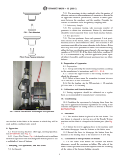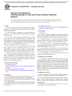 ASTM D7842/D7842M-12(2021) is a standardized test method from ASTM International for determining the holding strength of tack and prong fastener attached buttons on textile fabrics, specifically for use in apparel. The method utilizes a tensile testing machine to apply force to buttons attached either by a tack (single post) or prong fastener (multiple prongs), assessing how well the button remains affixed under mechanical stress. This standard is essential for manufacturers, suppliers, and quality assurance professionals involved in garment production to verify the durability and compatibility of button attachments with various fabrics.