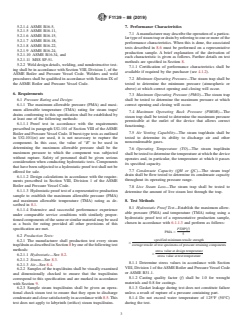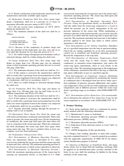 ABSTRACT This specification provides the minimum requirements for the design, fabrication, pressure rating, marking, and testing of steam traps and drains. Hydrostatic proof test, hydrostatic production shell test, steam production shell test, air production shell test, operational check steam test, and performance characteristics test shall be performed to meet the requirements prescribed. SCOPE 1.1 This specification2 provides the minimum requirements for the design, fabrication, pressure rating, marking, and testing of steam traps and drains. 1.2 The values stated in inch-pound units are to be regarded as standard. The values given in parentheses are mathematical conversions to SI units that are provided for information only and are not considered standard. 1.3 The following safety hazards caveat pertains only to the test method portion of this specification. This standard does not purport to address all of the safety concerns, if any, associated with its use. It is the responsibility of the user of this standard to establish appropriate safety, health, and environmental practices and determine the applicability of regulatory limitations prior to use. 1.4 This international standard was developed in accordance with internationally recognized principles on standardization established in the Decision on Principles for the Development of International Standards, Guides and Recommendations issued by the World Trade Organization Technical Barriers to Trade (TBT) Committee.