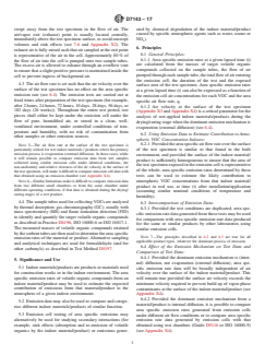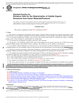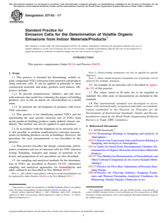 SIGNIFICANCE AND USE 5.1 Indoor materials/products are products or materials used for construction works or in the indoor environment. The area specific emission rates of volatile organic compounds from an indoor material/product may be used to estimate the expected contribution of emissions from that material/product to the atmosphere of a given indoor environment. 5.2 Emission data may also be used to compare and categorize different indoor materials/products of similar function. 5.3 Emission cell testing of area specific emissions may alternatively be used for studying secondary interactions (for example, sink effects (absorption and re-emission of volatile organics by the indoor material/product) or emissions generated by chemical degradation of the indoor material/product caused by specific atmospheric agents such as water, ozone or NOx). SCOPE 1.1 This practice is intended for determining volatile organic compound (VOC) emissions from materials and products using emission cells. It can be applied in principle to most construction materials and many products used indoors. Objectives include: 1.1.1 To provide manufacturers, builders, and end users with emission data useful for evaluating the impact of building products, new or old, on indoor air concentrations in a model room. 1.1.2 To promote the development of products with lower VOC emissions. 1.2 This practice is for identifying emitted VOCs and for determining the area specific emission rate of VOCs from newly produced building products under defined climate conditions. The method can also be applied to aged products. 1.3 In accordance with the definition of an emission cell, it is also possible to perform nondestructive emission measurements on building products on-site in buildings. However, the procedure for such measurements is not described in this practice. 1.4 This practice describes the design, construction, performance evaluation and use of emission cells for VOC emission testing. Sampling, transport and storage of materials to be tested, and preparation of test specimens are also described. 1.5 Air sampling and analytical methods for the determination of VOCs are described in Practice D6196. Alternative sampling and analytical approaches for formaldehyde and other carbonyls are described in Test Method D5197. Note 1: All volatile (vapor-phase) carbonyls except formaldehyde can be analyzed by either Practice D6196 or by Test Method D5197. Note 2: Direct-reading instruments can also be applied for specific objectives. Note 3: Some volatile inorganic compounds can, in principle, also be analyzed (for example, ammonia). 1.6 An example of an emission cell is described in Appendix X2 of this practice. 1.7 The values stated in SI units are to be regarded as standard. No other units of measurement are included in this standard. 1.8 This international standard was developed in accordance with internationally recognized principles on standardization established in the Decision on Principles for the Development of International Standards, Guides and Recommendations issued by the World Trade Organization Technical Barriers to Trade (TBT) Committee.
