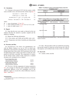 SIGNIFICANCE AND USE 5.1 This test method for testing cotton for non-lint content is considered satisfactory for acceptance testing of commercial shipments since it is the best available procedure for obtaining objective data. 5.1.1 If there are differences of practical significance between reported test results for two laboratories (or more), comparative tests should be performed to determine if there is a statistical bias between them, using competent statistical assistance. As a minimum, ensure the test samples to be used are as homogeneous as possible, are drawn from the material from which the disparate test results were obtained, and are randomly assigned in equal numbers to each laboratory for testing. The test results from the two laboratories should be compared using a statistical test for unpaired data, at a probability level chosen prior to the testing series. If a bias is found, either its cause must be found and corrected, or future test results for that material must be adjusted in consideration of the known bias. 5.2 This test method gives data on the non-lint content of raw cotton which can be used as a basis for: (1) estimating the net amount of manufactured textile product obtainable from raw cotton; (2) predicting the quality of cotton textile products, particularly their aesthetic properties; (3) assembling and blending bales in a mix on a non-lint content basis; (4) adjusting ginning and textile processing machines for maximum efficiency in cleaning lint; and (5) relating non-lint content of cotton to end-product quality and processing efficiency. SCOPE 1.1 This test method covers the determination of the non-lint content of cotton using the Shirley Analyzer. The cotton may be in the form of (1) raw stock, that is, cotton fiber that has been separated from the seed by ginning; (2) partially processed cotton, such as picker lap or sliver; or (3) ginning or processing waste, such as obtained from ginning, opening and cleaning, picking, carding, or combing machines. 1.2 This test method is especially adapted for determining non-lint content of cotton by use of the Shirley Analyser. 1.3 The values stated in SI units are to be regarded as standard. The values given in parentheses after SI units are provided for information only and are not considered standard. 1.4 This standard does not purport to address all of the safety concerns, if any, associated with its use. It is the responsibility of the user of this standard to establish appropriate safety, health, and environmental practices and determine the applicability of regulatory limitations prior to use. For specific hazard statements, see Section 7. 1.5 This international standard was developed in accordance with internationally recognized principles on standardization established in the Decision on Principles for the Development of International Standards, Guides and Recommendations issued by the World Trade Organization Technical Barriers to Trade (TBT) Committee.