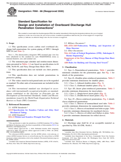 ASTM F994-86(2022) establishes the standard specification for the design and installation of overboard discharge hull penetration connections for marine system piping. Developed by ASTM International, this standard applies specifically to carbon steel hull penetrations for nominal pipe sizes (NPS) ranging from 1 to 24. It provides clear classification, material requirements, general installation practices, and design guidance to ensure the safety, structural integrity, and efficiency of overboard discharge systems on vessels. This standard does not cover sea chest penetrations or penetrations within protective plating, focusing solely on direct hull connections.