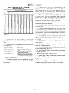 ABSTRACT This specification covers carbon steel overboard discharge hull penetrations for system piping. Penetrations shall be classified as follows: Type I; Type II (Class 1 and Class 2); Type III (Class 1 and Class 2); and Type IV (Classes 1, 2, and 3). Doubler and insert plates shall be of material with physical properties equal to or better than the reinforced shell plate. Overboard discharges shall be combined to the maximum extent practicable to minimize the number of shell penetrations. Overboard discharges shall be located to minimize recirculation into suction seachests. Shell penetrations shall be located outside of cathodic protection areas. Penetration pipe extension past the shell plate shall be equal to the pipe wall thickness. SCOPE 1.1 This specification covers carbon steel overboard discharge hull penetrations for system piping of NPS 1 through NPS 24 (see Note 1). Note 1: The dimensionless designator NPS (nominal pipe size) has been substituted in this standard for such TRADITIONAL terms as nominal diameter, size, and nominal size. 1.2 The minimum pipe schedule and reinforcement dimensions presented in Tables 1-6 are based on specifications in 46 CFR, 56.50-95, and Navy Design Data Sheet 100-1. 1.3 This specification does not include sea chest penetrations. 1.4 This specification does not include penetrations in protective plating. 1.5 The values stated in inch-pound units are to be regarded as standard. No other units of measurement are included in this standard. 1.6 This international standard was developed in accordance with internationally recognized principles on standardization established in the Decision on Principles for the Development of International Standards, Guides and Recommendations issued by the World Trade Organization Technical Barriers to Trade (TBT) Committee.