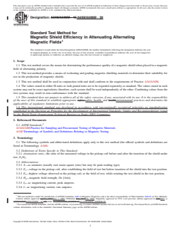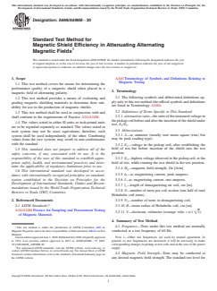 SIGNIFICANCE AND USE 5.1 This test method provides an easy, accurate, and reproducible method for determination of shielding factors (attenuation ratios) in simple alternating magnetic fields. 5.2 Since the sensing or pickup coil is of finite size, the measured shielding factor tends to be the average value for the space enclosed by the coil. Due care is required when interpreting results when the coil is located near an opening in the shield. 5.3 This test method is suitable for design, specification acceptance, service evaluation, quality assurance, and research purposes on magnetic shields. 5.4 Provided geometrically identical shields are compared, this test method is also suitable for evaluation and grading of magnetic shielding materials. SCOPE 1.1 This test method covers the means for determining the performance quality of a magnetic shield when placed in a magnetic field of alternating polarity. 1.2 This test method provides a means of evaluating and grading magnetic shielding materials to determine their suitability for use in the production of magnetic shields. 1.3 This test method shall be used in conjunction with and shall conform to the requirements of Practice A34/A34M. 1.4 The values stated in either SI units or inch-pound units are to be regarded separately as standard. The values stated in each system may not be exact equivalents; therefore, each system shall be used independently of the other. Combining values from the two systems may result in non-conformance with the standard. 1.5 This standard does not purport to address all of the safety concerns, if any, associated with its use. It is the responsibility of the user of this standard to establish appropriate safety, health, and environmental practices and determine the applicability of regulatory limitations prior to use. 1.6 This international standard was developed in accordance with internationally recognized principles on standardization established in the Decision on Principles for the Development of International Standards, Guides and Recommendations issued by the World Trade Organization Technical Barriers to Trade (TBT) Committee.