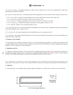 SIGNIFICANCE AND USE 5.1 Staples are mechanical fasteners used in wood structures. Engineering design procedures used to determine the capacities of laterally-loaded staple connections use a yield theory to establish nominal resistance (Note 2). In order to develop nominal resistance for laterally-loaded stapled connections, the bending yield moment must be known. Note 2: When used as a structural fastener in shear walls and diaphragms, staples are installed with the crown parallel to the long dimension of the framing member. The orientation of the staples for this bending yield moment test represents the bending yield moment applicable for this intended use). SCOPE 1.1 This test method covers procedures for determining the bending yield moment of staples when subjected to static loading. Although intended for flat crown staples identified in Specification F1667/F1667M, this procedure is also applicable for staples with round wire. These staples are used in engineered wood building connection applications for which required connection capacities are specified by the designer. 1.2 The values stated in either SI units or inch-pound units are to be regarded separately as standard. The values stated in each system are not necessarily exact equivalents; therefore, to ensure conformance with the standard, each system shall be used independently of the other, and values from the two systems shall not be combined. Note 1: This test method is applicable in either inch-pounds F3359 or SI Units [F3359M]. Values stated in SI are a mathematical conversion and are shown in brackets [ ]. 1.3 This standard does not purport to address all of the safety concerns, if any, associated with its use. It is the responsibility of the user of this standard to establish appropriate safety, health, and environmental practices and determine the applicability of regulatory limitations prior to use. 1.4 This international standard was developed in accordance with internationally recognized principles on standardization established in the Decision on Principles for the Development of International Standards, Guides and Recommendations issued by the World Trade Organization Technical Barriers to Trade (TBT) Committee.
