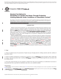 SIGNIFICANCE AND USE 5.1 This test method is used to measure chemical permeation through specimens of protective clothing under the condition of intermittent contact of a test chemical with the specimen. In many applications, protective clothing is contacted intermittently to chemicals, not continuously as is tested by Test Method F739. 5.2 This test method is normally used to evaluate flat specimens and seams from finished items of protective clothing and of materials that are candidates for items of protective clothing. 5.2.1 Finished items of protective clothing include gloves, sleeves, aprons, suits, coveralls, hoods, boots, respirators, and the like. 5.2.2 The phrase “specimens from finished items” encompasses seams or other discontinuous regions as well as continuous regions of protective clothing items. 5.2.3 Selected seams for testing are representative of seams used in the principal construction of the protective clothing item and typically include seams of both the base material and where the base material is joined with other types of materials. 5.3 In some cases, it may be of interest to compare permeation behaviors that occur under conditions of intermittent contact with those that occur during continuous contact. Test Method F739 is recommended for measuring permeation under the conditions of continuous contact of the test chemical with the protective clothing specimen. 5.4 The breakthrough detection time, standardized breakthrough time, and the cumulative permeation are key measures of the effectiveness of a clothing material to be a barrier to the test chemical. Such information is used in the comparison of clothing materials during the process of selecting clothing for protection from hazardous chemicals. Long breakthrough detection times and standardized breakthrough times and low amounts of cumulative permeation are characteristics of more effective barrier materials than materials with higher permeation characteristics. Note 1: At present, there ... SCOPE 1.1 This test method measures the permeation of liquids and gases through protective clothing materials under the condition of intermittent contact. 1.2 This test method is designed for use when the test chemical is a gas or a liquid, where the liquid is either volatile (that is, having a vapor pressure greater than 1 mm Hg at 25 °C) or soluble in water or another liquid that does not interact with the clothing material. 1.3 The values stated in SI units are to be regarded as standard. The values given in parentheses are mathematical conversions to inch-pound units that are provided for information only and are not considered standard. 1.4 This standard does not purport to address all of the safety concerns, if any, associated with its use. It is the responsibility of the user of this standard to establish appropriate safety, health, and environmental practices and determine the applicability of regulatory limitations prior to use. Specific hazard statements are given in Section 7. 1.5 This international standard was developed in accordance with internationally recognized principles on standardization established in the Decision on Principles for the Development of International Standards, Guides and Recommendations issued by the World Trade Organization Technical Barriers to Trade (TBT) Committee.