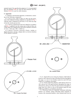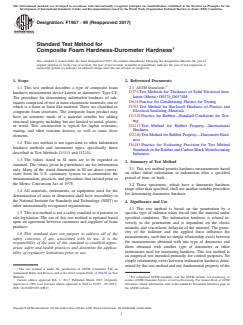 SIGNIFICANCE AND USE 4.1 This test method is based on the penetration by a specific type of indentor when forced into the material under specified conditions. The indentation hardness is related inversely to the penetration and is dependent on the elastic modulus and viscoelastic behavior of the material. The geometry of the indentor and the applied force influence the measurements, such that no simple relationship exists between the measurements obtained with one type of durometer and those obtained with another type of durometer or other instruments used for measuring hardness. This test method is an empirical test intended primarily for control purposes. No simple relationship exists between indentation hardness determined by this test method and any fundamental property of the material tested. For specification purposes it is recommended that Test Method D785 be used for hard materials and Test Method D2240 be used for solid elatomers. SCOPE 1.1 This test method describes a type of composite foam hardness measurement device known as durometer: Type CF. The procedure for determining indentation hardness of substances comprised of two or more elastomeric materials, one of which is a foam or foam like material. These are classified as composite foam structures. The composite foam product may have an armature made of a material suitable for adding structural integrity including but not limited to metal, plastic, or wood. This construction is typical for lapbar restraints, seating, and other restraint devices, as well as some show elements. 1.2 This test method is not equivalent to other indentation hardness methods and instrument types, specifically those described in Test Methods D1415 and D2240. 1.3 The values stated in SI units are to be regarded as standard. The values given in parentheses are for information only. Many of the stated dimensions in SI are direct conversions from the U.S. customary system to accommodate the instrumentation, practices, and procedures that existed prior to the Metric Conversion Act of 1975. 1.4 All materials, instruments, or equipment used for the determination of mass or dimension shall have traceability to the National Institute for Standards and Technology (NIST) or other internationally recognized organizations. 1.5 This test method is not a safety standard as it pertains to ride legislation. The use of this test method is optional based upon an agreement between customers and suppliers of foam products. 1.6 This standard does not purport to address all of the safety concerns, if any, associated with its use. It is the responsibility of the user of this standard to establish appropriate safety and health practices and determine the applicability of regulatory limitations prior to use.