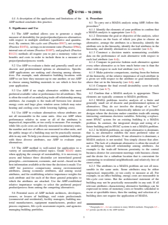 SIGNIFICANCE AND USE 5.1 The AHP method allows you to generate a single measure of desirability for project/product/process alternatives with respect to multiple attributes (qualitative and quantitative). By contrast, life-cycle cost (Practice E917), net savings (Practice E1074), savings-to-investment ratio (Practice E964), internal rate-of-return (Practice E1057), and payback (Practice E1121) methods all require you to put a monetary value on benefits and costs in order to include them in a measure of project/product/process worth. 5.2 Use AHP to evaluate a finite and generally small set of discrete and predetermined options or alternatives. Specific AHP applications are ranking and choosing among alternatives. For example, rank alternative building locations with AHP to see how they measure up to one another, or use AHP to choose among building materials to see which is best for your application. 5.3 Use AHP if no single alternative exhibits the most preferred available value or performance for all attributes. This is often the result of an underlying trade-off relationship among attributes. An example is the trade-off between low desired energy costs and large glass window areas (which may raise heating and cooling costs while lowering lighting costs). 5.4 Use AHP to evaluate alternatives whose attributes are not all measurable in the same units. Also use AHP when performance relative to some or all of the attributes is impractical, impossible, or too costly to measure. For example, while life-cycle costs are directly measured in monetary units, the number and size of offices are measured in other units, and the public image of a building may not be practically measurable in any unit. To help you choose among candidate buildings with these diverse attributes, use AHP to evaluate your alternatives. 5.5 The AHP method is well-suited for application to a variety of sustainability-related topics. Guide E2432 states when applying the concept of sustainability, it is necessary ... SCOPE 1.1 This practice presents a procedure for calculating and interpreting AHP scores of a project’s/product’s/process’ total overall desirability when making capital investment decisions.3 Projects include design, construction, operation, and disposal of commercial and residential buildings and other engineered structures.4 Products include materials, components, systems, and equipment.5 Processes include procurement, materials management, work flow, fabrication and assembly, quality control, and services. 1.2 In addition to monetary benefits and costs, the procedure allows for the consideration of characteristics or attributes which decision makers regard as important, but which are not readily expressed in monetary terms. Examples of such attributes that pertain to the selection among project/product/process alternatives are: a construction projects’s building alternatives whose nonmonetary attributes are location/accessibility, site security, maintainability, quality of the sound and visual environment, and image to the public and occupants; building products based on their economic and environmental performance; and sustainability-related issues for key construction processes that address environmental needs, while considering project safety, cost, and schedule. 1.3 This standard does not purport to address all of the safety concerns, if any, associated with its use. It is the responsibility of the user of this standard to establish appropriate safety, health, and environmental practices and determine the applicability of regulatory limitations prior to use. 1.4 This international standard was developed in accordance with internationally recognized principles on standardization established in the Decision on Principles for the Development of International Standards, Guides and Recommendations issued by the World Trade Organization Technical Barriers to Trade (TBT) Committee.