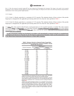 1.2.2.2 Grade B—Density equivalent to a maximum of 1.5 % porosity. The minimum density of those sections of the powder forged part so designated by the applicable part drawing shall not be less than the value specified in Table 1.