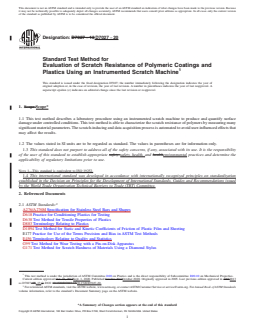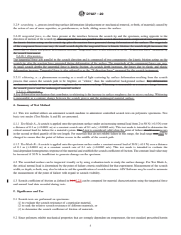 SIGNIFICANCE AND USE 5.1 Scratch tests are performed on specimens: (1) to evaluate the scratch resistance of a particular material, (2) to rank the relative scratch resistance of different materials, or (3) to determine the scratch coefficient of friction of materials. 5.2 Since polymers exhibit mechanical properties that are strongly dependent on temperature, the test standard prescribed herein is designed to yield reproducible results when users perform tests under the similar testing environment and on specimens of the same material and surface texture that are subjected to the same conditioning procedures. 5.3 Certain polymers are self-healing (recoverable) when subjected to scratches and other physical deformations because of their viscoelastic and relaxation properties. It is important to note the difference between the instantaneous (if readily measurable) and residual scratch damage and compare results appropriately to ensure reproducibility. It is recommended that 24 hours be allowed for viscoelastic recovery when considering residual scratch depth. 5.4 “Whitening” of the scratched surface is a key damage mechanism that has prompted much concern in automotive and other applications where surface aesthetics is important. This type of damage is undesirable because it is evident to the human eye. The critical normal load at which this phenomenon appears serves as a benchmark in ranking material performance, especially from an aesthetic point of view. SCOPE 1.1 This test method describes a laboratory procedure using an instrumented scratch machine to produce and quantify surface damage under controlled conditions. This test method is able to characterize the scratch resistance of polymers by measuring many significant material parameters. The scratch-inducing and data acquisition process is automated to avoid user-influenced effects that may affect the results. 1.2 The values stated in SI units are to be regarded as standard. The values in parentheses are for information only. 1.3 This standard does not purport to address all of the safety concerns, if any, associated with its use. It is the responsibility of the user of this standard to establish appropriate safety, health, and environmental practices and determine the applicability of regulatory limitations prior to use. Note 1: This standard is equivalent to ISO 19252. 1.4 This international standard was developed in accordance with internationally recognized principles on standardization established in the Decision on Principles for the Development of International Standards, Guides and Recommendations issued by the World Trade Organization Technical Barriers to Trade (TBT) Committee.
