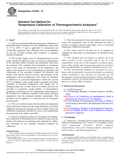SIGNIFICANCE AND USE 5.1 Thermogravimetric analyzers are used to characterize a broad range of materials. In most cases, one of the desired values to be assigned in thermogravimetric measurements is the temperature at which significant changes in specimen mass occur. Therefore, the temperature axis (abscissa) of all apparent-mass-change curves must be calibrated accurately, either by direct reading of a temperature sensor, or by adjusting the programmer temperature to match the actual temperature over the temperature range of interest. In the latter case, this is accomplished by the use of either melting point or magnetic transition standards. 5.2 This test method permits interlaboratory comparison and intralaboratory correlation of instrumental temperature scale data. SCOPE 1.1 This test method describe the temperature calibration of thermogravimetric analyzers over the temperature range from 25 °C to 1500 °C and is applicable to commercial and custom-built apparatus. This calibration may be accomplished by the use of either melting point standards or magnetic transition standards. 1.2 The weight change curve in thermogravimetry results from a number of influences, some of which are characteristic of the specimen holder assembly and atmosphere rather than the specimen. The variations from instrument to instrument occur in the point of measurement of the temperature, the nature of the material, its size and packing, the geometry and composition of the specimen container, the geometry and design of the furnace, and the accuracy and sensitivity of the temperature sensor and displaying scales. These all contribute to differences in measured temperatures, which may exceed 20 °C. In addition, some sample holder assemblies will show variations of measured temperature with sample size or heating/cooling rate, or both. Since it is neither practical nor advisable to standardize sample holders or thermobalance geometries, instruments may be calibrated by measurement of the deviation of a melting or magnetic (Curie point) transition temperature from the standard reference temperature. This deviation can be applied as a correction term to subsequent measurements. 1.3 This test method assumes that the indicated temperature of the instrument is linear over the range defined by a two-point calibration and that this linearity has been verified. These two calibration temperatures should be as close to the experimental measurements to be made as possible. 1.4 This test method describes two procedures for temperature calibration of thermogravimetric analyzers using any type balance. Procedure A uses melting point standards for calibration. Procedure B uses magnetic transition standards for calibration. 1.5 The data generated by these procedures can be used to correct the temperature scale of the instrument by either a positive or negative amount using either a one- or two-point temperature calibration procedure. 1.6 The values stated in SI units are to be regarded as standard. No other units of measurement are included in this standard. 1.7 This standard does not purport to address all of the safety concerns, if any, associated with its use. It is the responsibility of the user of this standard to establish appropriate safety, health, and environmental practices and determine the applicability of regulatory limitations prior to use. 1.8 This international standard was developed in accordance with internationally recognized principles on standardization established in the Decision on Principles for the Development of International Standards, Guides and Recommendations issued by the World Trade Organization Technical Barriers to Trade (TBT) Committee.