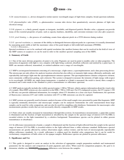 SIGNIFICANCE AND USE 5.1 This guide is designed to assist an analyst in the selection of appropriate sample preparation methods and instrumental parameters for the analysis and comparison of paint pigments and colors. When used for comparison purposes, the goal is to determine whether any exclusionary differences exist between the samples. 5.2 Paint sample spectra can be measured by reflectance or transmittance spectroscopy for comparison purposes. Transmittance measurements are generally preferred and are required for the analysis of UV absorbers in clear coats and the detailed analysis of effect pigments that are not opaque. Emission comparison by means of fluorescence is also measurable. 5.3 It is not the intention of this guide to present comprehensive theories and methods of MSP. It is necessary that the analyst have an understanding of UV-Vis-NIR MSP and general concepts of specimen preparation before using this guide. This information is available from manufacturers’ reference materials, training courses, and references such as Eyring (1),3 Stoecklein (2), and Purcell (3). SCOPE 1.1 This guide is intended to assist forensic analysts who conduct UV, visible, NIR, or fluorescence emission spectral analyses on small fragments of paint or use Guide E1610, as this guide is to be used in conjunction with a broader analytical scheme. 1.2 This guide deals primarily with color measurements within the visible spectral range but will also include some details concerning measurements in the UV and NIR spectral ranges. The particular method(s) employed by each analyst depends upon available equipment, examiner training (Practices E2917, E3234), sample suitability, and sample size. 1.3 This guide provides basic recommendations and information about microspectrophotometers. 1.4 This guide does not address other areas of color evaluation such as colorimetric values, paint surface texture or pigment particle size, shape, or dispersion within a paint film that are evaluated by other forms of microscopy. 1.5 This guide is directed at the color analysis of commercially prepared paints and coatings. It does not address the analysis or determination of provenance of artistic, historical, or restorative paints, but it could be useful in those fields. 1.6 The values stated in SI units are to be regarded as standard. No other units of measurement are included in this standard. 1.7 This standard is intended for use by competent forensic science practitioners with the requisite formal education, discipline-specific training (see Practices E2917, E3234), and demonstrated proficiency to perform forensic casework. 1.8 This standard does not purport to address all of the safety concerns, if any, associated with its use. It is the responsibility of the user of this standard to establish appropriate safety, health, and environmental practices and determine the applicability of regulatory limitations prior to use. 1.9 This international standard was developed in accordance with internationally recognized principles on standardization established in the Decision on Principles for the Development of International Standards, Guides and Recommendations issued by the World Trade Organization Technical Barriers to Trade (TBT) Committee.