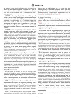 5.2 Paint sample spectra can be measured by reflectance or transmittance spectroscopy for comparison purposes. Transmittance measurements are generally preferred and are required for the analysis of UV absorbers in clear coats and the detailed analysis of effect pigments that are not opaque. Emission comparison by means of fluorescence is also measurable.