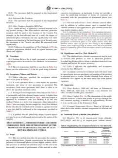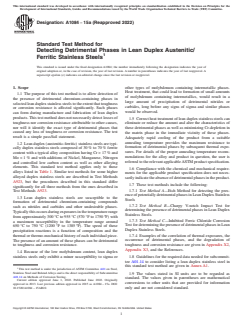 SIGNIFICANCE AND USE 4.1 Test Method A shall only be used to supplement the results of Test Methods B and C. It shall not be used as a rejection criterion, nor shall it be used as an acceptance criterion. Test Methods B and C are intended to be the procedures giving the acceptance criteria for this standard. 4.2 Test Method A can reveal potentially detrimental phases in the metallographic structure. As the precipitated detrimental phases can be very small, this test demands high proficiency from the metallographer, especially for thinner material. 4.3 The presence of detrimental phases is readily detected by Test Methods B and C provided that a sample of appropriate location and orientation is selected. 4.4 The tests do not determine the precise nature of the detrimental phase but rather the presence or absence to the extent that the normally expected toughness and corrosion resistance of the material are significantly affected. 4.5 This standard covers testing of samples taken from coil, coil- and plate mill plate, sheet, tubing, piping, bar and deformed bar, though some of these products might not be suitable for testing according to Method B (see Test Method B for further details). Other product forms have thus far not been sufficiently tested and documented to be an integral part of this standard, though the standard does not prohibit testing of these product forms according to the three test methods. For these other product forms, this standard gives only limited and non-exhaustive guidance as to interpretation of result and associated acceptance criteria. 4.6 Testing on product forms outside the present scope of this standard shall be agreed between purchaser and supplier. SCOPE 1.1 The purpose of this test method is to allow detection of the presence of detrimental chromium-containing phases in selected lean duplex stainless steels to the extent that toughness or corrosion resistance is affected significantly. Such phases can form during manufacture and fabrication of lean duplex products. This test method does not necessarily detect losses of toughness nor corrosion resistance attributable to other causes, nor will it identify the exact type of detrimental phases that caused any loss of toughness or corrosion resistance. The test result is a simple pass/fail statement. 1.2 Lean duplex (austenitic-ferritic) stainless steels are typically duplex stainless steels composed of 30 % to 70 % ferrite content with a typical alloy composition having Cr > 17 % and Mo Table 1. Similar test methods for some higher alloyed duplex stainless steels are described in Test Methods A923, but the procedures described in this standard differ significantly for all three methods from the ones described in Test Methods A923. 1.3 Lean duplex stainless steels are susceptible to the formation of detrimental chromium-containing compounds such as nitrides and carbides and other undesirable phases. Typically this occurs during exposures in the temperature range from approximately 300 °C to 955 °C (570 °F to 1750 ºF) with a maximum susceptibility in the temperature range around 650 °C to 750 °C (1200 °F to 1385 ºF). The speed of these precipitation reactions is a function of composition and the thermal or thermo-mechanical history of each individual piece. The presence of an amount of these phases can be detrimental to toughness and corrosion resistance. 1.4 Because of the low molybdenum content, lean duplex stainless steels only exhibit a minor susceptibility to sigma or other types of molybdenum containing intermetallic phases. Heat treatment, that could lead to formation of small amounts of molybdenum containing intermetallics, would result in a large amount of precipitation of detrimental nitrides or carbides, long before any signs of sigma and similar phases would be observed. 1.5 Correct heat treatment of lean duplex stainless steels can eliminate or reduce the amount and alter the characteristics of t...