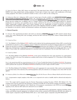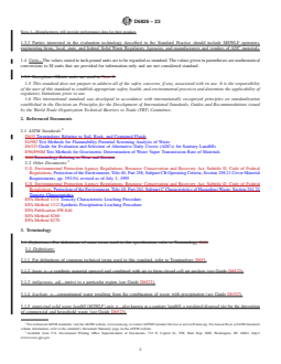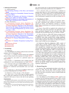 ABSTRACT This specification defines procedures for determining the performance of certain landfill daily cover materials such as sprayed slurries, foams, and indigenous materials generally described as an alternative daily cover (ADC) for municipal solid waste landfills. It is not applicable to other types of landfills and to geosynthetics used as an ADC. It addresses the evaluation of an ADC and its ability to control fires and odors and whether or not the cover contains materials that present a threat to human health and the environment. Materials shall be tested at accredited laboratories to determine the physical properties such as potential for fire production, water vapor permeance, toxicity, and leaching potential. The control of disease vectors and blowing litter shall be evaluated by observation while scavenging shall be controlled by security procedures and other operating practices. SCOPE 1.1 This specification defines procedures for determining the performance of certain landfill daily cover materials generally described as an alternative daily cover (ADC). This specification applies only to slurries or foams that are spray applied, or indigenous materials that are placed onto the working face of a municipal solid waste landfill (MSWLF) unit as a cover. It is not applicable to other types of landfills nor geosynthetics used as an ADC. 1.2 This standard addresses the evaluation of an ADC and its ability to control fires and odors and whether or not the cover contains materials that present a threat to human health and the environment. The control of disease vectors and blowing litter can be evaluated by observation, and scavenging is controlled by security procedures and other operating practices. 1.3 The U.S. Environmental Protection Agency (EPA) promulgated regulations under the Resource Conservation and Recovery Act, Subtitle D, which establish criteria for municipal solid waste landfills (MSWLF). These regulations became effective October 9, 1991. The cover material requirements of these regulations are set forth in 40 Code of Federal Regulations, Section 258.21 as follows: (a) “Except as provided in paragraph (b) of this section, the owners or operators of all MSWLF units must cover disposed solid waste with 6 in. (152.4 mm) of earthen material at the end of each operating day, or at more frequent intervals if necessary, to control disease vectors, fires, odors, blowing litter, and scavenging.” (b) “Alternative materials of an alternative thickness (other than at least 6 in. (152.4 mm) of earthen material) may be approved by the Director of the Solid Waste Regulatory Agency of an approved State if the owner or operator demonstrates that the alternative material and thickness control disease vectors, fires, odors, blowing litter, and scavenging without presenting a threat to human health and the environment.” 1.3.1 These federal regulations have the force of the law, and it is the purpose of this specification to define the test procedures necessary to comply with these regulations. 1.3.2 In order for a MSWLF landfill operator to obtain approval for use of an ADC, the operator must supply performance data to the state Solid Waste Regulatory Agency. In general, the technique used to obtain this permission involves applying to the state Solid Waste Regulatory agency for a sanitary MSWLF operating permit modification. Note 1: Manufacturers will provide performance data for their product. 1.3.3 Parties interested in the evaluation technology described in the Standard Practice should include MSWLF operators, engineering firms, local, state, and federal Solid Waste Regulatory Agencies, and manufacturers and vendors of ADC materials. 1.4 Units—The values stated in inch-pound units are to be regarded as standard. The values given in parentheses are mathematical conversions to SI units that are provided for information only and are not considered standard. 1.5 This standard does ...