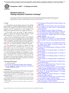 SIGNIFICANCE AND USE 4.1 This guide is intended to provide assistance in selecting appropriate tests for evaluating the general performance level to be expected of a coating or coating system on a given substrate exposed to a given type of environment. Table 1 represents a listing of all the tests. 4.2 Surface preparation or cleanliness prior to application of the coating can be critical to the proper performance of the coating. 4.3 Results obtained in the tests cited in this guide may not be adequate for predicting coating service life of a specific coating system in a specific environmental exposure. A suitable control coating system of known performance in the service environment should be included in the testing for comparison. SCOPE 1.1 This guide covers the selection and use of test methods and procedures for testing industrial protective coatings. Selection of the standards to be followed must be governed by experience and the requirements in each individual case, together with agreement between the supplier and the user. 1.2 This guide covers the testing of liquid coatings as applied on substrate by brushing, rolling, spraying, or other means appropriate to the coating and circumstance. Note 1: The term “industrial protective coating” as used in this guide is described in the scope of Subcommittee D01.461 as “paints applied to substrates on-site of structures and buildings, especially where subject to corrosive environments, as industrial, urban, and marine environments.” Note 2: Guides for testing other coating types, such as Guides D4712, D5146, D5324 or for surface preparation, coating application, such as Guide D3276, are available and should be used when it is applicable. 1.3 This standard does not purport to address all of the safety concerns, if any, associated with its use. It is the responsibility of the user of this standard to establish appropriate safety, health, and environmental practices and determine the applicability of regulatory limitations prior to use. 1.4 This international standard was developed in accordance with internationally recognized principles on standardization established in the Decision on Principles for the Development of International Standards, Guides and Recommendations issued by the World Trade Organization Technical Barriers to Trade (TBT) Committee.