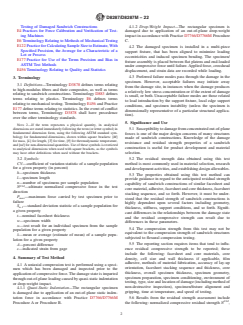 SIGNIFICANCE AND USE 5.1 Susceptibility to damage from concentrated out-of-plane forces is one of the major design concerns of many structures made of sandwich constructions. Knowledge of the damage resistance and residual strength properties of a sandwich construction is useful for product development and material selection. 5.2 The residual strength data obtained using this test method is most commonly used in material selection, research and development activities, and establishing design allowables. 5.3 The properties obtained using this test method can provide guidance in regard to the anticipated residual strength capability of sandwich constructions of similar facesheet and core material, adhesive, facesheet and core thickness, facesheet stacking sequence, and so forth. However, it must be understood that the residual strength of sandwich constructions is highly dependent upon several factors including geometry, thickness, stiffness, support conditions, and so forth. Significant differences in the relationships between the damage state and the residual compressive strength can result due to differences in these parameters. 5.4 The compression strength from this test may not be equivalent to the compression strength of sandwich structures subjected to flexural compression testing. 5.5 The reporting section requires items that tend to influence residual compressive strength to be reported; these include the following: facesheet and core materials, core density, cell size and wall thickness if applicable, film adhesive, methods of material fabrication, accuracy of lay-up orientation, facesheet stacking sequence and thickness, core thickness, overall specimen thickness, specimen geometry, specimen preparation, specimen conditioning, environment of testing, type, size and location of damage (including method of non-destructive inspection), specimen/fixture alignment and gripping, time at temperature, and speed of testing. 5.6 Results from the residual strength assessmen... SCOPE 1.1 This test method covers compression residual strength properties of sandwich constructions that have been subjected to quasi-static indentation or drop-weight impact per Practice D7766/D7766M. Note 1: When used to determine the residual strength of drop-weight impacted plates, this test method is commonly referred to as the Sandwich Compression After Impact test method. 1.2 Several important test specimen parameters (for example, facesheet thickness, core thickness, and core density) are not mandated by this test method; however, repeatable results require that these parameters be specified and reported. 1.3 The method utilizes a flat, rectangular specimen, previously subjected to a damaging event, which is tested under edgewise compressive loading using a stabilization fixture. 1.4 The properties generated by this test method are highly dependent upon several factors, which include; specimen geometry, sandwich component materials and dimensions (facesheet, core, and adhesive), methods of fabrication, the type, size, and location of damage and boundary conditions. Thus, results are generally not scalable to other sandwich constructions, and are particular to the combination of geometric and physical conditions tested. 1.5 This test method can be used to test undamaged specimens, but care should be taken to prevent undesirable failure modes such as end crushing. Test Methods C364 and D7249/D7249M are the recommended test methods for undamaged sandwich panel compression strength by edgewise compression or long beam flexure, respectively. 1.6 Units—The values stated in either SI units or inch-pound units are to be regarded separately as standard. The values stated in each system are not necessarily exact equivalents; therefore, to ensure conformance with the standard, each system shall be used independently of the other, and values from the two systems shall not be combined. 1.6.1 Within the text, t...