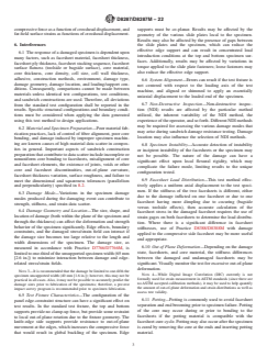 5.5 The reporting section requires items that tend to influence residual compressive strength to be reported; these include the following: facesheet and core materials, core density, cell size and wall thickness if applicable, film adhesive, methods of material fabrication, accuracy of lay-up orientation, facesheet stacking sequence and thickness, core thickness, overall specimen thickness, specimen geometry, specimen preparation, specimen conditioning, environment of testing, type, size and location of damage (including method of non-destructive inspection), specimen/fixture alignment and gripping, time at temperature, and speed of testing.