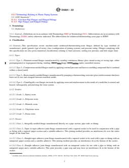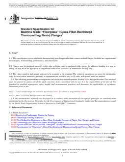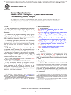ASTM D4024-22 is a technical specification published by ASTM International. Its full title is "Standard Specification for Machine Made “Fiberglass” (Glass-Fiber-Reinforced Thermosetting Resin) Flanges". This standard covers: ABSTRACT This specification deals with the testing and performance requirements of machine made "fiberglass" (glass-fiber-reinforced thermosetting resin) flanges, other than those that are contact-molded. Flanges may be produced integrally with a pipe or fitting, may be produced with a socket for adhesive bonding to a pipe or fitting, or may be of the type used in conjunction with either a metallic or nonmetallic backup ring. Flanges are defined by type (method of manufacture), grade (generic type of resin), class (configuration of joining system), and pressure rating. Flanges are also given numerical classifications relating to rupture pressure, sealing test pressure, and bolt torque limit. Included are requirements for materials, workmanship, performance, and dimensions. SCOPE 1.1 This specification covers reinforced-thermosetting resin flanges other than contact-molded flanges. Included are requirements for materials, workmanship, performance, and dimensions. 1.2 Flanges may be produced integrally with a pipe or fitting, may be produced with a socket for adhesive bonding to a pipe or fitting, or may be of the type used in conjunction with either a metallic or nonmetallic backup ring. 1.3 The values stated in inch-pound units are to be regarded as the standard. The values in parentheses are given for information only. In cases where materials, products, or equipment are available only in SI units, inch-pound units are omitted. 1.4 The following precautionary caveat pertains only to the test methods portion, Section 10, of this specification: This standard does not purport to address all of the safety concerns, if any, associated with its use. It is the responsibility of the user of this standard to establish appropriate safety, health, and environmental practices and determine the applicability of regulatory limitations prior to use. Note 1: Contact molded flanges are covered in Specification D5421 and referenced in Specification D5685. Note 2: There is no known ISO equivalent to this standard. 1.5 This international standard was developed in accordance with internationally recognized principles on standardization established in the Decision on Principles for the Development of International Standards, Guides and Recommendations issued by the World Trade Organization Technical Barriers to Trade (TBT) Committee.
