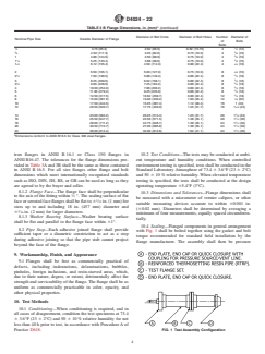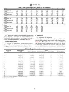 ABSTRACT This specification deals with the testing and performance requirements of machine made "fiberglass" (glass-fiber-reinforced thermosetting resin) flanges, other than those that are contact-molded. Flanges may be produced integrally with a pipe or fitting, may be produced with a socket for adhesive bonding to a pipe or fitting, or may be of the type used in conjunction with either a metallic or nonmetallic backup ring. Flanges are defined by type (method of manufacture), grade (generic type of resin), class (configuration of joining system), and pressure rating. Flanges are also given numerical classifications relating to rupture pressure, sealing test pressure, and bolt torque limit. Included are requirements for materials, workmanship, performance, and dimensions. SCOPE 1.1 This specification covers reinforced-thermosetting resin flanges other than contact-molded flanges. Included are requirements for materials, workmanship, performance, and dimensions. 1.2 Flanges may be produced integrally with a pipe or fitting, may be produced with a socket for adhesive bonding to a pipe or fitting, or may be of the type used in conjunction with either a metallic or nonmetallic backup ring. 1.3 The values stated in inch-pound units are to be regarded as the standard. The values in parentheses are given for information only. In cases where materials, products, or equipment are available only in SI units, inch-pound units are omitted. 1.4 The following precautionary caveat pertains only to the test methods portion, Section 10, of this specification: This standard does not purport to address all of the safety concerns, if any, associated with its use. It is the responsibility of the user of this standard to establish appropriate safety, health, and environmental practices and determine the applicability of regulatory limitations prior to use. Note 1: Contact molded flanges are covered in Specification D5421 and referenced in Specification D5685. Note 2: There is no known ISO equivalent to this standard. 1.5 This international standard was developed in accordance with internationally recognized principles on standardization established in the Decision on Principles for the Development of International Standards, Guides and Recommendations issued by the World Trade Organization Technical Barriers to Trade (TBT) Committee.