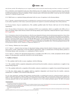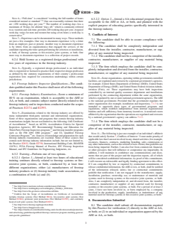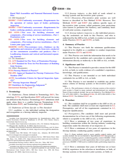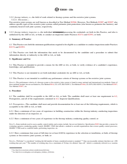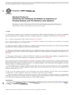 SIGNIFICANCE AND USE 5.1 This Practice is intended to provide a means for the AHJ or AA, or both, to verify evidence of a candidate’s experience, knowledge, and qualifications. 5.2 This Practice is not intended to set forth individual credentials for an AHJ or AA, or both. 5.3 This Practice is not intended to establish any performance criteria of firestop systems or fire-resistive joint systems. Note 4: The performance criteria of a firestop system or fire-resistive joint system is found in many national and international test methods. Some of these methods include, but are not limited to, Test Method E814, UL 1479, ISO 10295-1, Test Method E1966, UL 2079, ISO 10295-2, Test Method E2307, Test Method E2837, etc. SCOPE 1.1 This practice is intended to assist an authority having jurisdiction (AHJ) or authorizing authority (AA), or both, in establishing minimum qualifications for candidates who desire to conduct inspections in compliance with Practices E2174 and E2393. Note 1: Authority having jurisdiction (AHJ) is defined in Practices E2174 and E2393. Note 2: Authorizing authority (AA) is defined in Practices E2174 and E2393. Examples of the AA include, but are not limited to, the responsible architect, engineer, building owner, or their representative. 1.2 This practice makes available a procedure for a candidate to provide evidence to the AHJ or AA, or both, of their specialized knowledge and technical competence related to the firestop industry. 1.3 This practice determines the technical proficiency of a candidate based upon a minimum amount of education, experience, and knowledge possessed, which is needed to ensure candidate competence to conduct inspections in compliance with Practices E2174 and E2393. 1.4 The purpose of this practice is to allow the AHJ or AA, or both, to assess the ability of the candidate to comprehend and use inspection documents to conduct inspections in compliance with Practices E2174 and E2393. Note 3: Inspection document is defined in Practices E2174 and E2393. The firestop submittal, when approved for use, should have sufficient details, including, but not limited to, the firestop manufacturer’s product data, a design listing of the tested firestop, and when required a judgment (Alternative Means and Methods). The judgment is commonly referred to as an “Engineering Judgment” in the firestop industry. These judgments are not always issued by an engineer or a registered design professional. 1.5 This standard does not purport to address all of the safety concerns, if any, associated with its use. It is the responsibility of the user of this standard to establish appropriate safety, health, and environmental practices and determine the applicability of regulatory limitations prior to use. 1.6 The text of this standard references notes and footnotes that provide explanatory material. These notes and footnotes (excluding those in tables and figures) shall not be considered as requirements of the standard. 1.7 This international standard was developed in accordance with internationally recognized principles on standardization established in the Decision on Principles for the Development of International Standards, Guides and Recommendations issued by the World Trade Organization Technical Barriers to Trade (TBT) Committee.
