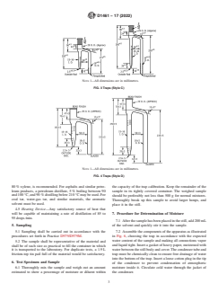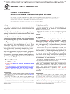 SIGNIFICANCE AND USE 3.1 This test method is used for determining either the amount of moisture or the amount of volatile petroleum distillates in asphalt mixtures. 3.2 Applicable standards are those in which measurements or calibrations are made, samples are procured, or products are selected.3 SCOPE 1.1 This test method covers the determination, by direct measurement, of moisture or volatile fractions of the asphalt in asphalt mixtures. 1.2 The values stated in SI units are to be regarded as the standard. No other units of measurement are included in this standard. 1.3 The text of this standard references notes and footnotes which provide explanatory material. These notes and footnotes (excluding those in tables and figures) shall not be considered as requirements of the standard. 1.4 This standard does not purport to address all of the safety concerns, if any, associated with its use. It is the responsibility of the user of this standard to establish appropriate safety, health, and environmental practices and determine the applicability of regulatory limitations prior to use. 1.5 This international standard was developed in accordance with internationally recognized principles on standardization established in the Decision on Principles for the Development of International Standards, Guides and Recommendations issued by the World Trade Organization Technical Barriers to Trade (TBT) Committee.