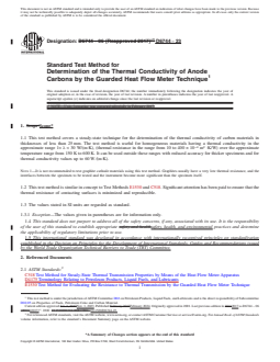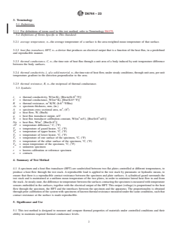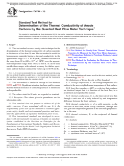 SIGNIFICANCE AND USE 5.1 This test method is designed to measure and compare thermal properties of materials under controlled conditions and their ability to maintain required thermal conductance levels. SCOPE 1.1 This test method covers a steady-state technique for the determination of the thermal conductivity of carbon materials in thicknesses of less than 25 mm. The test method is useful for homogeneous materials having a thermal conductivity in the approximate range 1−4 m2 ·K/W) over the approximate temperature range from 150 K to 600 K. It can be used outside these ranges with reduced accuracy for thicker specimens and for thermal conductivity values up to 60 W/(m·K). Note 1: It is not recommended to test graphite cathode materials using this test method. Graphites usually have a very low thermal resistance, and the interfaces between the specimen to be tested and the instrument become more significant than the specimen itself. 1.2 This test method is similar in concept to Test Methods E1530 and C518. Significant attention has been paid to ensure that the thermal resistance of contacting surfaces is minimized and reproducible. 1.3 The values stated in SI units are regarded as standard. 1.3.1 Exception—The values given in parentheses are for information only. 1.4 This standard does not purport to address all of the safety concerns, if any, associated with its use. It is the responsibility of the user of this standard to establish appropriate safety, health, and environmental practices and determine the applicability of regulatory limitations prior to use. 1.5 This international standard was developed in accordance with internationally recognized principles on standardization established in the Decision on Principles for the Development of International Standards, Guides and Recommendations issued by the World Trade Organization Technical Barriers to Trade (TBT) Committee.