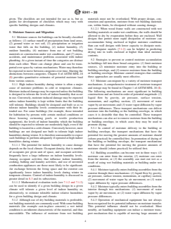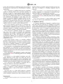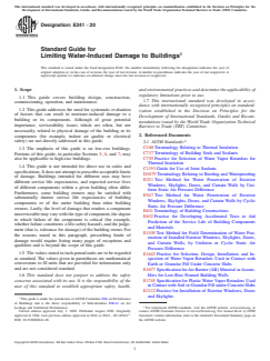 SIGNIFICANCE AND USE 4.1 Moisture degradation is frequently a significant factor that either limits the useful life of a building or necessitates costly repairs. Examples of moisture degradation include: (1) decay of wood-based materials, (2) spalling of masonry caused by freeze-thaw cycles, (3) damage to gypsum plasters by dissolution, (4) corrosion of metals, (5) damage due to expansion of materials or components (by swelling due to moisture pickup, or by expansion due to corrosion, hydration, or delayed ettringite formation), (6) spalling and degradation caused by salt migration, (7) failure of finishes, and (8) creep deformation and reduction in strength or stiffness. 4.1.1 Moisture accumulation within construction components or constructions may adversely affect serviceability of a building, without necessarily causing immediate and serious degradation of the construction components. Examples of such serviceability issues are: (1) indoor air quality, (2) electrical safety, (3) degradation of thermal performance of insulations, and (4) decline in physical appearance. Mold or mildew growth can influence indoor air quality and physical appearance. With some components, in particular interior surface finishes, mold or mildew growth may limit service life of the component. Moisture conditions that affect serviceability issues can frequently be expected, unless corrected, to eventually result in degradation of the building or its components. This guide does not attempt however to address serviceability issues that could be corrected by cleaning and change in building operation, and that would not require repair or replacement of components to return the building (or portions or components of the building) to serviceability. 4.2 Prevention of water-induced damage must be considered throughout the construction process including the various stages of the design process, construction, and building commissioning. It must also be considered in building operation and maintenance, and when... SCOPE 1.1 This guide covers building design, construction, commissioning, operation, and maintenance. 1.2 This guide addresses the need for systematic evaluation of factors that can result in moisture-induced damage to a building or its components. Although of great potential importance, serviceability issues which are often, but not necessarily, related to physical damage of the building or its components (for example, indoor air quality or electrical safety) are not directly addressed in this guide. 1.3 The emphasis of this guide is on low-rise buildings. Portions of this guide; in particular Sections 5, 6, and 7; may also be applicable to high-rise buildings. 1.4 This guide is not intended for direct use in codes and specifications. It does not attempt to prescribe acceptable limits of damage. Buildings intended for different uses may have different service life expectancies, and expected service lives of different components within a given building often differ. Furthermore, some building owners may be satisfied with substantially shorter service life expectancies of building components or of the entire building than other building owners. Lastly, the level of damage that renders a component unserviceable may vary with the type of component, the degree to which failure of the component is critical (for example, whether failure constitutes a life-safety hazard), and the judgement (that is, tolerance for damage) of the building owner. For the reasons stated in this paragraph, prescribing limits of damage would require listing many pages of exceptions and qualifiers and is beyond the scope of this guide. 1.5 The values stated in inch-pound units are to be regarded as standard. The values given in parentheses are mathematical conversions to SI units that are provided for information only and are not considered standard. 1.6 This standard does not purport to address the safety concerns associated with its use. It...