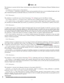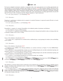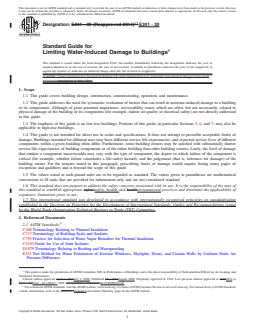 ASTM E241-20 is a guide published by ASTM International. Its full title is "Standard Guide for Limiting Water-Induced Damage to Buildings". This standard covers: SIGNIFICANCE AND USE 4.1 Moisture degradation is frequently a significant factor that either limits the useful life of a building or necessitates costly repairs. Examples of moisture degradation include: (1) decay of wood-based materials, (2) spalling of masonry caused by freeze-thaw cycles, (3) damage to gypsum plasters by dissolution, (4) corrosion of metals, (5) damage due to expansion of materials or components (by swelling due to moisture pickup, or by expansion due to corrosion, hydration, or delayed ettringite formation), (6) spalling and degradation caused by salt migration, (7) failure of finishes, and (8) creep deformation and reduction in strength or stiffness. 4.1.1 Moisture accumulation within construction components or constructions may adversely affect serviceability of a building, without necessarily causing immediate and serious degradation of the construction components. Examples of such serviceability issues are: (1) indoor air quality, (2) electrical safety, (3) degradation of thermal performance of insulations, and (4) decline in physical appearance. Mold or mildew growth can influence indoor air quality and physical appearance. With some components, in particular interior surface finishes, mold or mildew growth may limit service life of the component. Moisture conditions that affect serviceability issues can frequently be expected, unless corrected, to eventually result in degradation of the building or its components. This guide does not attempt however to address serviceability issues that could be corrected by cleaning and change in building operation, and that would not require repair or replacement of components to return the building (or portions or components of the building) to serviceability. 4.2 Prevention of water-induced damage must be considered throughout the construction process including the various stages of the design process, construction, and building commissioning. It must also be considered in building operation and maintenance, and when... SCOPE 1.1 This guide covers building design, construction, commissioning, operation, and maintenance. 1.2 This guide addresses the need for systematic evaluation of factors that can result in moisture-induced damage to a building or its components. Although of great potential importance, serviceability issues which are often, but not necessarily, related to physical damage of the building or its components (for example, indoor air quality or electrical safety) are not directly addressed in this guide. 1.3 The emphasis of this guide is on low-rise buildings. Portions of this guide; in particular Sections 5, 6, and 7; may also be applicable to high-rise buildings. 1.4 This guide is not intended for direct use in codes and specifications. It does not attempt to prescribe acceptable limits of damage. Buildings intended for different uses may have different service life expectancies, and expected service lives of different components within a given building often differ. Furthermore, some building owners may be satisfied with substantially shorter service life expectancies of building components or of the entire building than other building owners. Lastly, the level of damage that renders a component unserviceable may vary with the type of component, the degree to which failure of the component is critical (for example, whether failure constitutes a life-safety hazard), and the judgement (that is, tolerance for damage) of the building owner. For the reasons stated in this paragraph, prescribing limits of damage would require listing many pages of exceptions and qualifiers and is beyond the scope of this guide. 1.5 The values stated in inch-pound units are to be regarded as standard. The values given in parentheses are mathematical conversions to SI units that are provided for information only and are not considered standard. 1.6 This standard does not purport to address the safety concerns associated with its use. It...