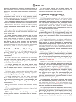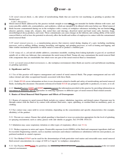 SIGNIFICANCE AND USE 4.1 Use of this practice will improve management and control of metal removal fluids. The proper management and use will reduce dermal and other occupational hazards associated with these fluids. 4.1.1 Guide E2148 covers information on how to use documents related to health and safety of metalworking and metal removal fluids, including this document. Documents referenced in Guide E2148 are grouped as applicable to producers, to users, or to all. 4.1.2 Practices E2693 and E2889 augment the information provided in this practice by providing information on prevention of dermatitis and on approaches to reducing exposures to different types of metal removal fluid related aerosols. SCOPE 1.1 This practice sets forth guidelines for the selection and safe use of metal removal fluids, additives, and antimicrobials. This includes product selection, storage, dispensing, and maintenance. 1.2 Water-miscible metal removal fluids are typically used at high dilution, and dilution rates vary widely. Additionally, there is potential for exposure to undiluted metal removal fluid as manufactured, as well as metal removal fluid additives and antimicrobials. 1.3 Straight oils generally consist of a severely solvent-refined or hydro-treated petroleum oil, a synthetic oil, or other oils of animal or vegetable origin, including oils that are modified for performance characteristics (for example, esterified rapeseed oil, and so forth). Straight oils are not intended to be diluted with water prior to use. Additives are often included in straight oil formulations. 1.4 The values stated in SI units are to be regarded as standard. No other units of measurement are included in this standard. 1.5 This standard does not purport to address all of the safety concerns, if any, associated with its use. It is the responsibility of the user of this standard to establish appropriate safety, health, and environmental practices and determine the applicability of regulatory limitations prior to use. 1.6 This international standard was developed in accordance with internationally recognized principles on standardization established in the Decision on Principles for the Development of International Standards, Guides and Recommendations issued by the World Trade Organization Technical Barriers to Trade (TBT) Committee.