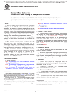 ASTM D4902-99(2020) is a standard published by ASTM International. Its full title is "Standard Test Method for Evaporation and Drying of Analytical Solutions". This standard covers: SIGNIFICANCE AND USE 4.1 This test method is useful for determining the solid residue in analytical solutions. 4.2 Because of the possibility of unknown errors in this test method, it is essential that the procedure be followed exactly in order to obtain reproducible results, both among specimens within a laboratory and for analyses between laboratories. SCOPE 1.1 This test method covers a procedure for the evaporating and drying of the 100 mL portions of analytical solution obtained in the methods for vegetable tannin analysis, so that consistent results may be obtained for the determination of total solids, soluble solids, and non-tannins in the sample. This test method is also intended for use in determining the moisture in the hide powder samples and the moisture in raw and spent materials in the methods for vegetable tannin analysis. 1.2 The values stated in SI units are to be regarded as standard. No other units of measurement are included in this standard. 1.3 This standard does not purport to address all of the safety concerns, if any, associated with its use. It is the responsibility of the user of this standard to establish appropriate safety, health, and environmental practices and determine the applicability of regulatory limitations prior to use. 1.4 This international standard was developed in accordance with internationally recognized principles on standardization established in the Decision on Principles for the Development of International Standards, Guides and Recommendations issued by the World Trade Organization Technical Barriers to Trade (TBT) Committee.