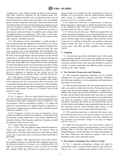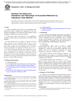ASTM C384-04(2022) is a standard published by ASTM International. Its full title is "Standard Test Method for Impedance and Absorption of Acoustical Materials by Impedance Tube Method". This standard covers: SIGNIFICANCE AND USE 5.1 The acoustical impedance properties of a sound absorptive material are related to its physical properties, such as airflow resistance, porosity, elasticity, and density. As such, the measurements described in this test method are useful in basic research and product development of sound absorptive materials. 5.2 Normal incidence sound absorption coefficients are more useful than random incidence coefficients in certain situations. They are used, for example, to predict the effect of placing material in a small enclosed space, such as inside a machine. 5.3 Estimates of the random incidence or statistical absorption coefficients for materials can be obtained from normal incidence impedance data. For materials that are locally reacting, that is, without sound propagation inside the material parallel to its surface, statistical absorption coefficients can be estimated from specific normal acoustic impedance values using an expression derived by London (1).5 Locally reacting materials include those with high internal losses parallel with the surface such as porous or fibrous materials of high density or materials that are backed by partitioned cavities such as a honeycomb core. Formulas for estimating random incidence sound absorption properties for both locally and bulk-reacting materials, as well as for multilayer systems with and without air spaces have also been developed (2). SCOPE 1.1 This test method covers the use of an impedance tube, alternatively called a standing wave apparatus, for the measurement of impedance ratios and the normal incidence sound absorption coefficients of acoustical materials. 1.2 The values stated in SI units are to be regarded as standard. No other units of measurement are included in this standard. 1.3 This standard does not purport to address all of the safety concerns, if any, associated with its use. It is the responsibility of the user of this standard to establish appropriate safety, health, and environmental practices and determine the applicability of regulatory limitations prior to use. 1.4 This international standard was developed in accordance with internationally recognized principles on standardization established in the Decision on Principles for the Development of International Standards, Guides and Recommendations issued by the World Trade Organization Technical Barriers to Trade (TBT) Committee.