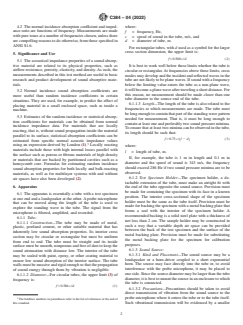 SIGNIFICANCE AND USE 5.1 The acoustical impedance properties of a sound absorptive material are related to its physical properties, such as airflow resistance, porosity, elasticity, and density. As such, the measurements described in this test method are useful in basic research and product development of sound absorptive materials. 5.2 Normal incidence sound absorption coefficients are more useful than random incidence coefficients in certain situations. They are used, for example, to predict the effect of placing material in a small enclosed space, such as inside a machine. 5.3 Estimates of the random incidence or statistical absorption coefficients for materials can be obtained from normal incidence impedance data. For materials that are locally reacting, that is, without sound propagation inside the material parallel to its surface, statistical absorption coefficients can be estimated from specific normal acoustic impedance values using an expression derived by London (1).5 Locally reacting materials include those with high internal losses parallel with the surface such as porous or fibrous materials of high density or materials that are backed by partitioned cavities such as a honeycomb core. Formulas for estimating random incidence sound absorption properties for both locally and bulk-reacting materials, as well as for multilayer systems with and without air spaces have also been developed (2). SCOPE 1.1 This test method covers the use of an impedance tube, alternatively called a standing wave apparatus, for the measurement of impedance ratios and the normal incidence sound absorption coefficients of acoustical materials. 1.2 The values stated in SI units are to be regarded as standard. No other units of measurement are included in this standard. 1.3 This standard does not purport to address all of the safety concerns, if any, associated with its use. It is the responsibility of the user of this standard to establish appropriate safety, health, and environmental practices and determine the applicability of regulatory limitations prior to use. 1.4 This international standard was developed in accordance with internationally recognized principles on standardization established in the Decision on Principles for the Development of International Standards, Guides and Recommendations issued by the World Trade Organization Technical Barriers to Trade (TBT) Committee.