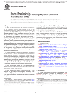 ASTM F2908-23 specifies the minimum requirements for an Unmanned Aircraft Flight Manual (UFM) for an unmanned aircraft system (UAS) in the light UAS category as defined by a Civil Aviation Authority (CAA). This international standard provides a comprehensive framework for manufacturers to supply essential flight and operational documentation as part of the sale or transfer of a UAS. The standard also guides compliance with regulatory requirements for airworthiness and operational approval, ensuring the end user receives clear, accurate, and maintenance-ready information for safe UAS operation.