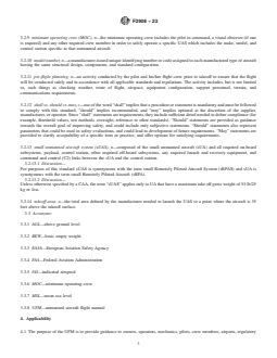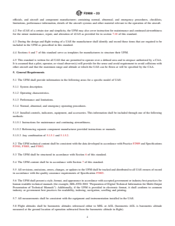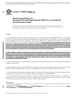 SCOPE 1.1 This specification provides the minimum requirements for an Unmanned Aircraft Flight Manual (UFM) for an unmanned aircraft system (UAS) designed, manufactured, and operated in the light UAS category as defined by a Civil Aviation Authority (CAA). Depending on the size and complexity of the UAS, an UFM may also contain the instruction for maintenance and continuing airworthiness for owner / operator authorized maintenance. This document has been purposefully designed within the broader context of the Committee F38 library. Although the original source materials for the content presented here were intended to function as standalone documents, the committee has consciously removed any redundant information in favor of adopting a referential "single-source-of-truth" approach. Consequently, when applying this standard, it is essential to consider and integrate all relevant Committee F38 standards to ensure its comprehensive and accurate implementation. 1.2 When intending to utilize the information provided in this document as a Means of Compliance for operational or design approval, or both, it is crucial to consult with the respective oversight authority (for example, CAA) regarding its acceptable use and application. To find out which oversight authorities have accepted this standard (in whole or in part) as an acceptable Means of Compliance to their regulatory requirements (hereinafter "the Rules"), please refer to the Committee F38 webpage (www.ASTM.org/COMMITTEE/F38.htm). 1.3 This specification defines the UFM information that shall be provided by the manufacturer of a UAS as part of the initial sale or transfer to an end user. 1.4 This specification applies to a UAS seeking a CAA approval, in the form of airworthiness certificates, type certificates, flight permits, or other like documentation as a UAS, in the configuration specified in the UFM delivered with the system. 1.5 Any modifications that invalidate or otherwise affect the accuracy of UFM operating instructions shall be approved by the manufacturer and communicated to the regulatory authority in the certificate / permit application. 1.6 This international standard was developed in accordance with internationally recognized principles on standardization established in the Decision on Principles for the Development of International Standards, Guides and Recommendations issued by the World Trade Organization Technical Barriers to Trade (TBT) Committee.
