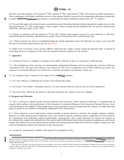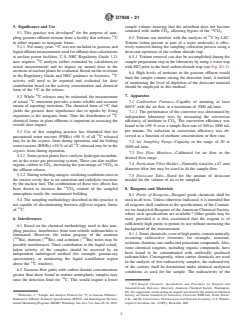 SIGNIFICANCE AND USE 5.1 This practice was developed4 for the purpose of sampling gaseous effluent streams from a facility that releases 14C in either organic or inorganic forms. 5.1.1 For many years 14C was not included in gaseous and liquid effluent measurements used for effluent dose calculations at nuclear power facilities. U.S. NRC Regulatory Guide 1.21 now requires 14C analysis (either estimated by calculation or actual measurement) and its impact on annual dose in the environs of nuclear plants be evaluated. Based on the revisions to the Regulatory Guide and NRC guidance to licensees, 14C activity will need to be reported and evaluated for dose contribution based on the activity concentration and chemical form of the 14C in the release. 5.2 While 14C releases may be estimated, the measurement of actual 14C emissions provides a more reliable and accurate means of reporting emissions. The chemical form of 14C that yields the greatest dose significance due to uptake by living organisms is the inorganic form. Thus the distribution of 14C chemical forms in plant effluents is important in assessing the overall dose impact. 5.3 Use of this sampling practice has identified that for pressurized water reactors (PWRs) >90 % of all 14C released may be in the organic form during operation, and for boiling water reactors (BWRs) 14C released may be in the organic form during operation. 5.3.1 Some power plants have catalytic hydrogen recombiners in the waste gas processing system. These can also oxidize organic carbon to CO2, increasing the percentage of 14CO2 in the effluent release. 5.3.2 During refueling outages, oxidizing conditions exist in the reactor cavity due to air saturation and radiolytic reactions by the nuclear fuel. The combination of these two effects has been shown to increase the 14CO2 content of the sampled atmosphere inside the containment building. 5.4 The sampling methodology described in this practice is not capable of discriminating between different org... SCOPE 1.1 The intended use of this practice is for sampling of gasses containing 14C in inorganic, organic or particulate forms. This sampling practice captures the 14C in a media that can be submitted to a laboratory for analysis, typically by liquid scintillation counting (LSC) 1.2 This practice does not include the needed steps for the liberation of 14C from the media on which it was adsorbed or those for the preparation for LSC sample preparation in the laboratory prior to liquid scintillation analysis. This practice does not include the methodology used to analyze the prepared samples by LSC. 1.3 The overall 14C analytical detection capability is impacted by a number of factors including the volume sampled, the method used to desorb the 14C from the media, and the analytical method used the measure 14C from the media. This practice only directly addresses the volume of the gas stream from which any present 14C would be adsorbed. 1.4 The values stated in pCi units are to be regarded as standard given the reporting requirements of the U.S. NRC Regulatory Guide 1.21. The Bq values given in parenthesis are mathematical conversions to SI units that are provided for information only and are not considered standard. Other values stated in SI units are to be regarded as standard. 1.5 This standard does not purport to address all of the safety concerns, if any, associated with its use. It is the responsibility of the user of this standard to establish appropriate safety, health, and environmental practices and determine the applicability of regulatory limitations prior to use. 1.6 This international standard was developed in accordance with internationally recognized principles on standardization established in the Decision on Principles for the Development of International Standards, Guides and Recommendations issued by the World Trade Organization Technical Barriers to Trade (TBT) Committee.