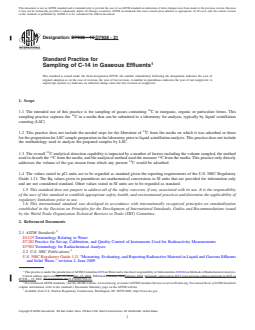 ASTM D7938-21: Standard Practice for Sampling of C-14 in Gaseous Effluents provides essential guidance for collecting samples containing carbon-14 (C-14) in gaseous effluents. This standard is published by ASTM International and is designed for use at facilities, such as nuclear power plants, that may release C-14 in either organic or inorganic forms into the atmosphere. The practice aims to support regulatory compliance-particularly with U.S. NRC Regulatory Guide 1.21-by enabling reliable assessment of the distribution and concentration of C-14, thereby supporting accurate dose calculations for environmental and public health monitoring.