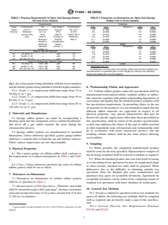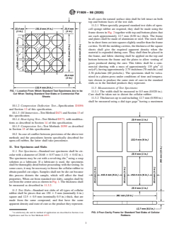 ABSTRACT This specification covers preformed open-cell sponge rubber gaskets, for use in new or reconditioned pails or drums, of the following classes: Class A and Class B, each divided into Grade 1, Grade 2, and Grade 3. Cellular sponge rubber gaskets shall be made by incorporating a blowing agent into the compound, such as sodium bicarbonate, that gives off a gas which expands the mass during the vulcanization process, and shall be manufactured from natural rubber, synthetic rubber, or rubber-like materials, together with added compounding ingredients. Unless otherwise specified, gasket sponge rubber shall have a natural skin on both the top and bottom surfaces. Cellular rubber shall conform to the prescribed requirements as to physical properties such as (1) compression at deflection, (2) change in volume upon oil immersion, (3) change in compression value after heat aging, (4) compression set, and (5) color (tan or black). The following test methods shall be used: (1) compression deflection test, (2) oil immersion test, (3) heat oven aging test, and (4) compression set test under constant deflection. The formula for calculating the compression set is given. The requirements for sampling, test specimens and slabs, and measurements of test specimen such as width and thickness are detailed as well. The location from which standard test specimens are to be cut when testing standard test slabs or commercial flat sheets and the four-cavity frame for standard test slabs of cellular rubbers are illustrated. SCOPE 1.1 This specification covers preformed open–cell sponge rubber gaskets of the following classes for use in new or reconditioned pails or drums. 1.1.1 Class A—Non–Oil Resistant. 1.1.2 Class B—Oil Resistant. 1.2 The values stated in SI units are to be regarded as the standard. 1.3 The following safety hazards caveat pertains only to Section 10, General Test Methods. This standard does not purport to address all of the safety concerns, if any, associated with its use. It is the responsibility of the user of this standard to establish appropriate safety, health, and environmental practices and determine the applicability of regulatory limitations prior to use. Note 1: ISO Equivalency Statement—This proposed specification was found to be not equivalent. 1.4 This international standard was developed in accordance with internationally recognized principles on standardization established in the Decision on Principles for the Development of International Standards, Guides and Recommendations issued by the World Trade Organization Technical Barriers to Trade (TBT) Committee.