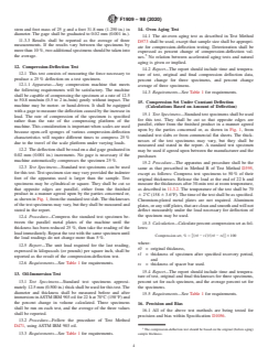 ASTM F1909-98(2020) is a technical specification published by ASTM International. Its full title is "Standard Specification for Preformed Open–Cell Sponge Rubber Pail and Drum Gaskets". This standard covers: ABSTRACT This specification covers preformed open-cell sponge rubber gaskets, for use in new or reconditioned pails or drums, of the following classes: Class A and Class B, each divided into Grade 1, Grade 2, and Grade 3. Cellular sponge rubber gaskets shall be made by incorporating a blowing agent into the compound, such as sodium bicarbonate, that gives off a gas which expands the mass during the vulcanization process, and shall be manufactured from natural rubber, synthetic rubber, or rubber-like materials, together with added compounding ingredients. Unless otherwise specified, gasket sponge rubber shall have a natural skin on both the top and bottom surfaces. Cellular rubber shall conform to the prescribed requirements as to physical properties such as (1) compression at deflection, (2) change in volume upon oil immersion, (3) change in compression value after heat aging, (4) compression set, and (5) color (tan or black). The following test methods shall be used: (1) compression deflection test, (2) oil immersion test, (3) heat oven aging test, and (4) compression set test under constant deflection. The formula for calculating the compression set is given. The requirements for sampling, test specimens and slabs, and measurements of test specimen such as width and thickness are detailed as well. The location from which standard test specimens are to be cut when testing standard test slabs or commercial flat sheets and the four-cavity frame for standard test slabs of cellular rubbers are illustrated. SCOPE 1.1 This specification covers preformed open–cell sponge rubber gaskets of the following classes for use in new or reconditioned pails or drums. 1.1.1 Class A—Non–Oil Resistant. 1.1.2 Class B—Oil Resistant. 1.2 The values stated in SI units are to be regarded as the standard. 1.3 The following safety hazards caveat pertains only to Section 10, General Test Methods. This standard does not purport to address all of the safety concerns, if any, associated with its use. It is the responsibility of the user of this standard to establish appropriate safety, health, and environmental practices and determine the applicability of regulatory limitations prior to use. Note 1: ISO Equivalency Statement—This proposed specification was found to be not equivalent. 1.4 This international standard was developed in accordance with internationally recognized principles on standardization established in the Decision on Principles for the Development of International Standards, Guides and Recommendations issued by the World Trade Organization Technical Barriers to Trade (TBT) Committee.